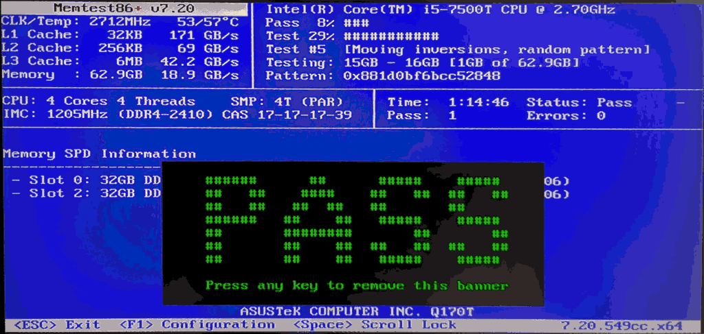In the same vein, Asus claims a maximum of 2x16GB for their Q170T, however the Intel website says 64GB should work with the i5 processor that’s in the machine, and indeed, here is a machine with 64GB happily passing memtest86+:
