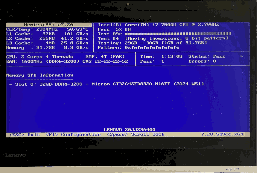I’ve picked up a Lenovo Yoga 370 because (amongst other features) it has a removable / upgradable RAM slot (yes, two slots would have been even better :)). You can find various sources (including ChatGPT) claiming it to be 16GB, however, if we look up the processor for this particular model on the Intel website, we’ll see that it supports up to 32GB. And indeed, here is the laptop, happily passing memtest86+ with a 32GB module (specifically this one):
